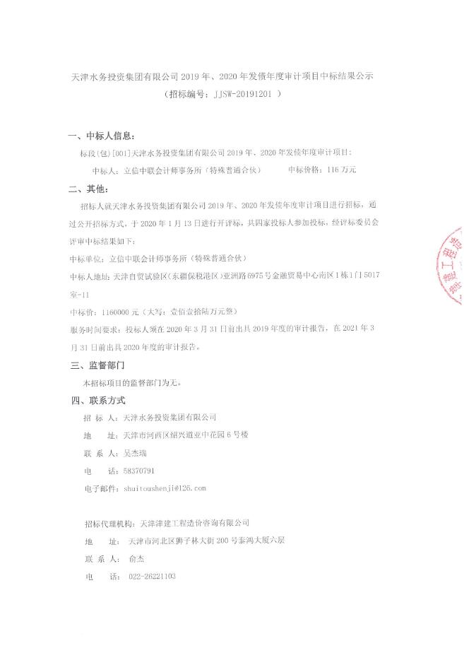 天津水務(wù)投資集團(tuán)有限公司2019年、2020年發(fā)債年度審計項目-中標(biāo)結(jié)果公示