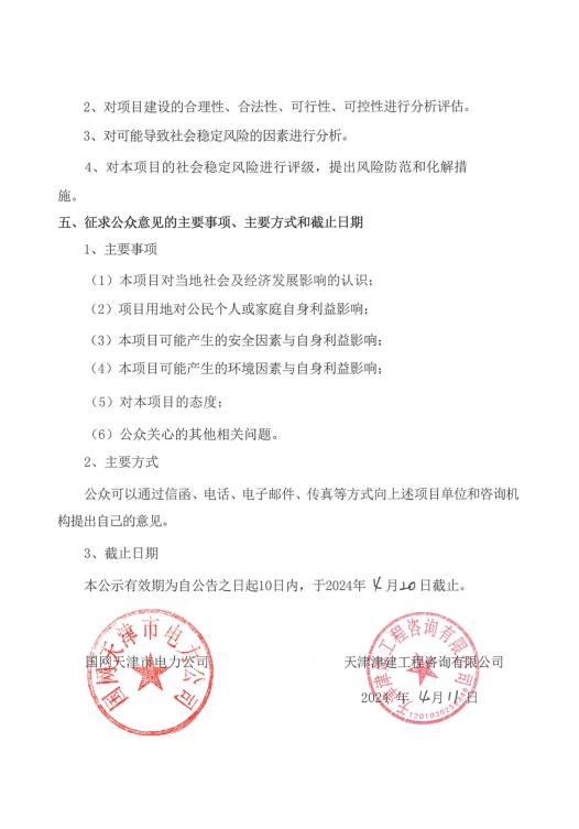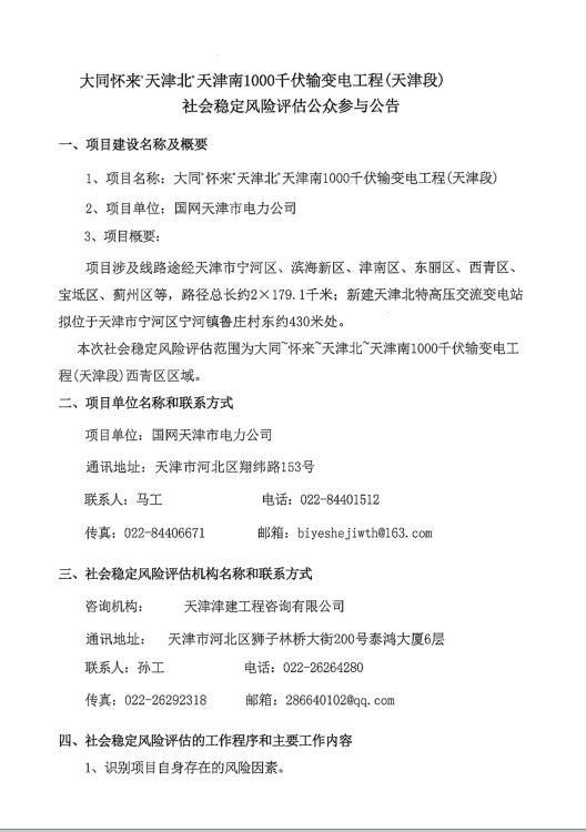 大同~懷來~天津北~天津南1000千伏輸變電工程(天津西青段)社會穩(wěn)定風險評估項目-公眾參與公告